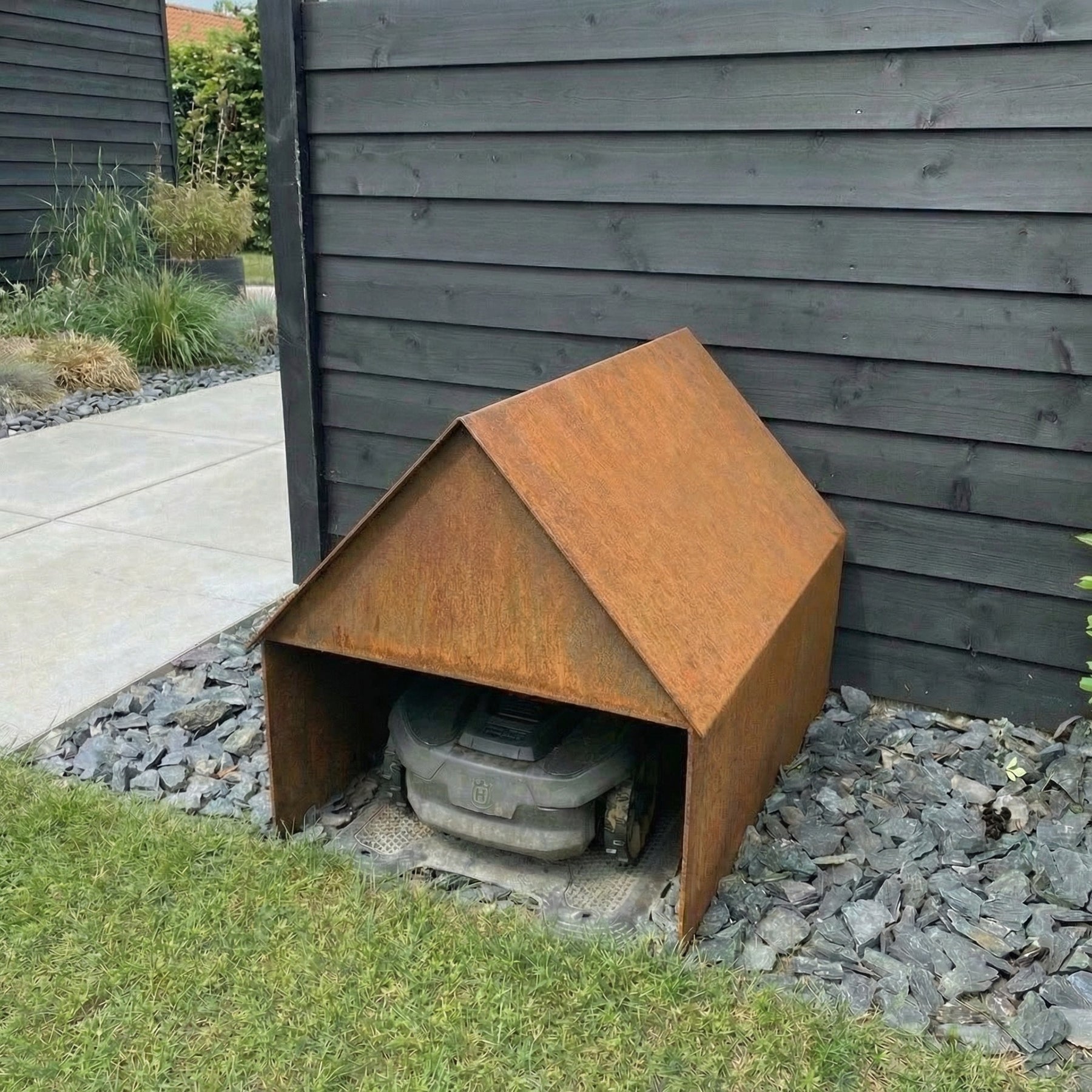 Unterstellplatz für Ihren Mähroboter – aus Cortenstahl gefertigt. Schützen Sie Ihren Mähroboter vor Wind und Regen mit einem schönen Unterstellplatz aus Cortenstahl – im gleichen Stil wie Ihre Pflanzkästen oder Beeteinfassungen aus Cortenstahl. Der Unterstellplatz ist an allen Ecken vollständig verschweißt.