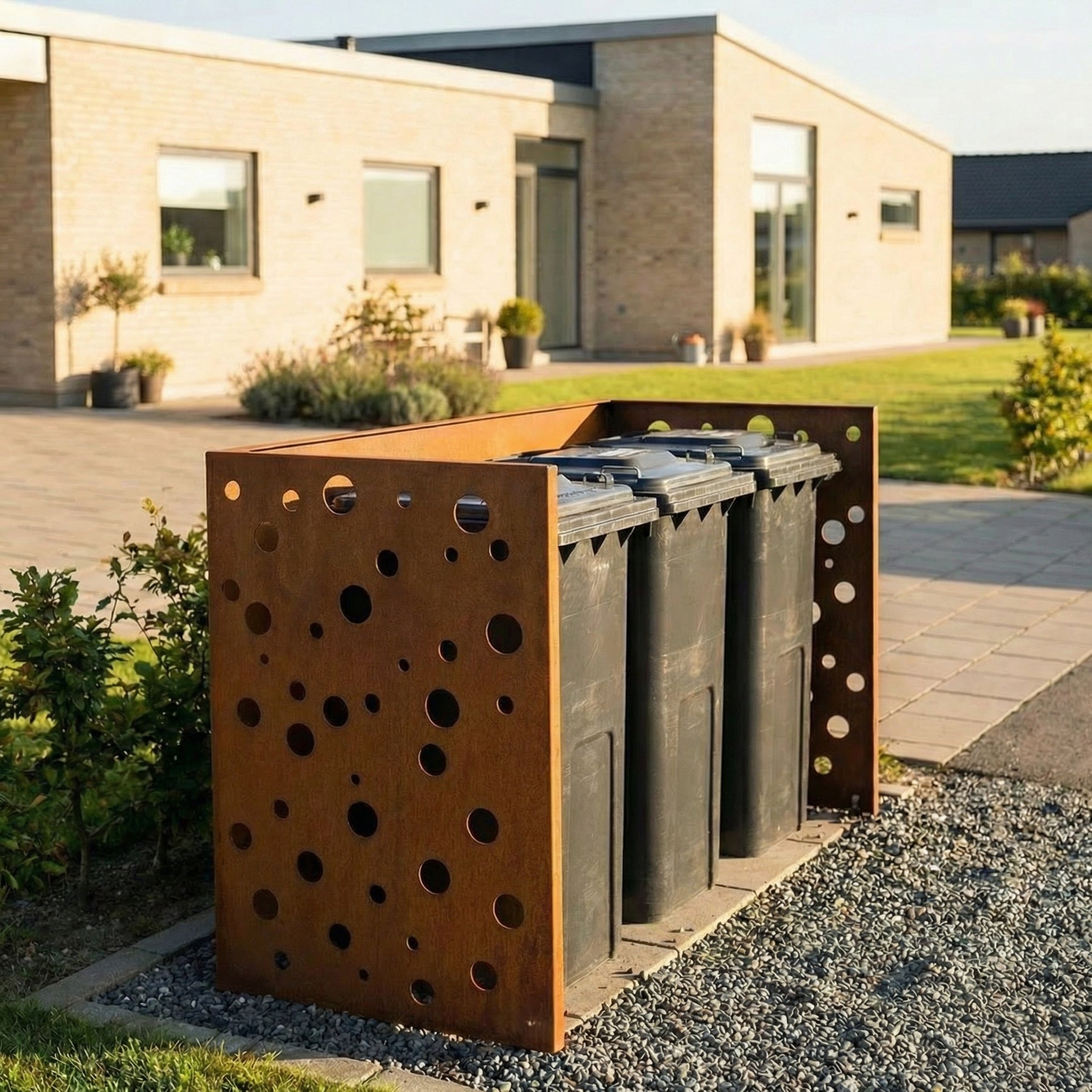 Einfacher, dennoch eleganter Abfallcontainerunterstand aus gerostetem Cortenstahl mit lasergeschnittenen Löchern als Highlight. Eine praktische Möglichkeit, die Abfallcontainer attraktiv abzuschirmen. Der Unterstand ist nicht nur eine elegante Lösung, sondern hat auch eine praktische Funktion: Er schützt die Abfallcontainer davor, vom Wind umgestoßen zu werden.