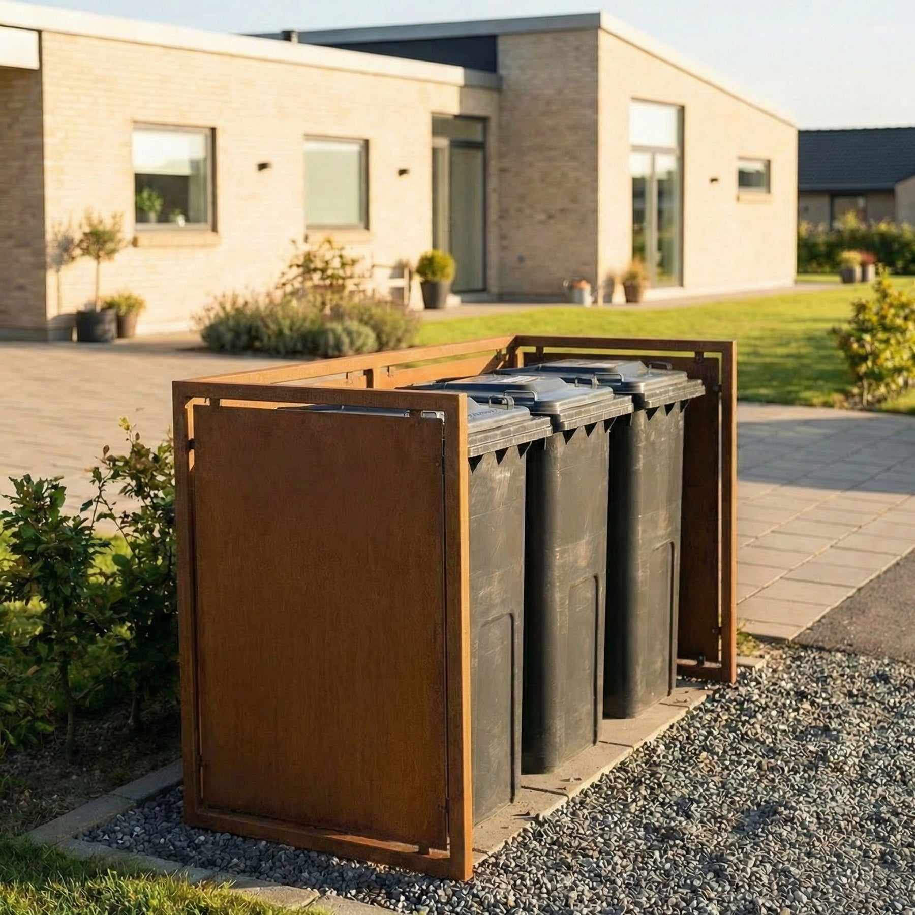 Sehr eleganter, massiver Abfallcontainerunterstand aus Cortenstahl. Eine praktische Möglichkeit, die Abfallcontainer attraktiv abzuschirmen. Die Unterstände sind nicht nur eine elegante Lösung, sondern erfüllen auch eine praktische Funktion: Sie schützen die Abfallcontainer davor, vom Wind umgestoßen zu werden.