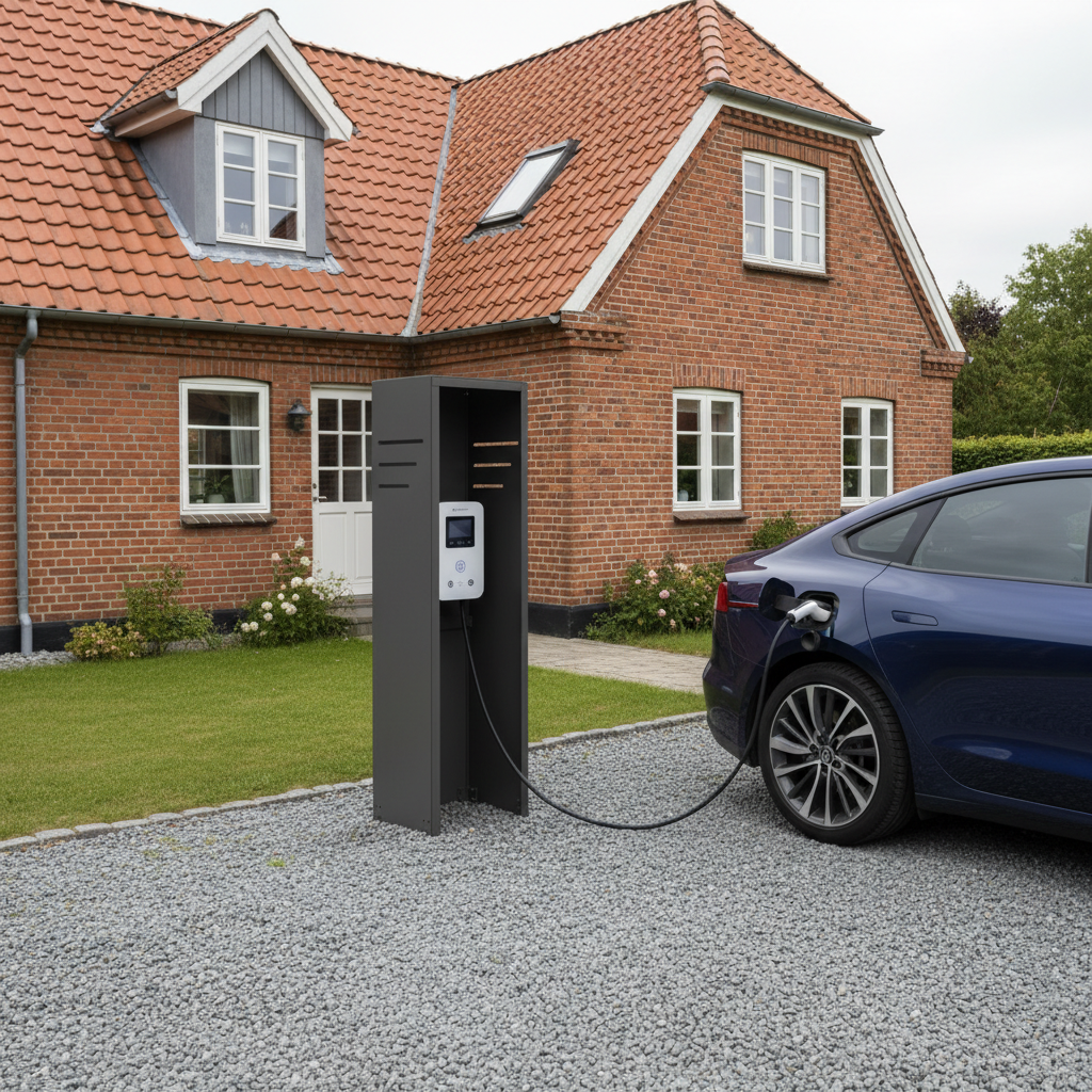 Dieses Modell wurde für stilbewusste Nutzer entwickelt, die eine unabhängige Platzierung der Wallbox wünschen – etwa im Carport oder direkt an der Auffahrt. Die Farbe harmoniert perfekt mit moderner nordischer Architektur.